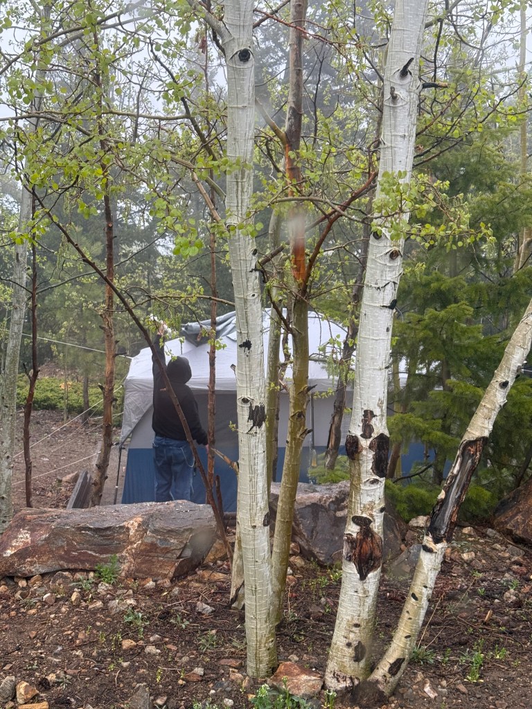 Update: About four hours later, the rain had really picked up, and midday, dad was back out again, this time stretching a separate tarp across the top of the tent, as apparently, the rain fly was not doing its job. I watched this poor fella drag the tarp across one side, just to have it come all the way across and fall to the ground. He finally got it in place and tied it off to a couple of the aspens you see close by, only to see him clothesline himself on a final lap around the tent. At this point, I am ready to invite them all in to the camper to warm up for a bit, except I am pretty sure I just heard the car drive away.