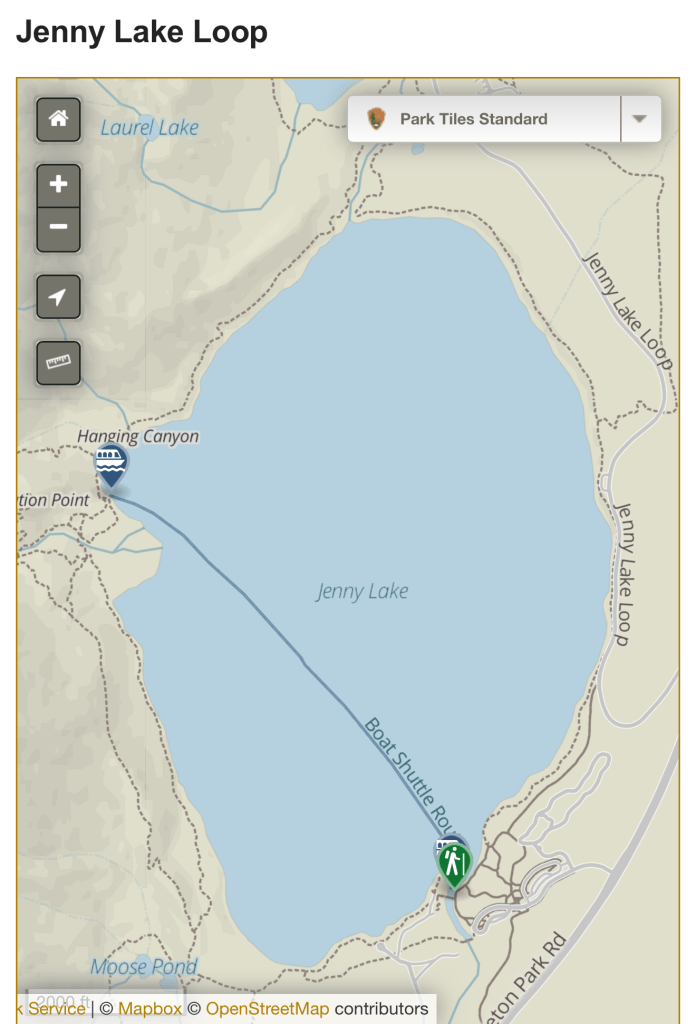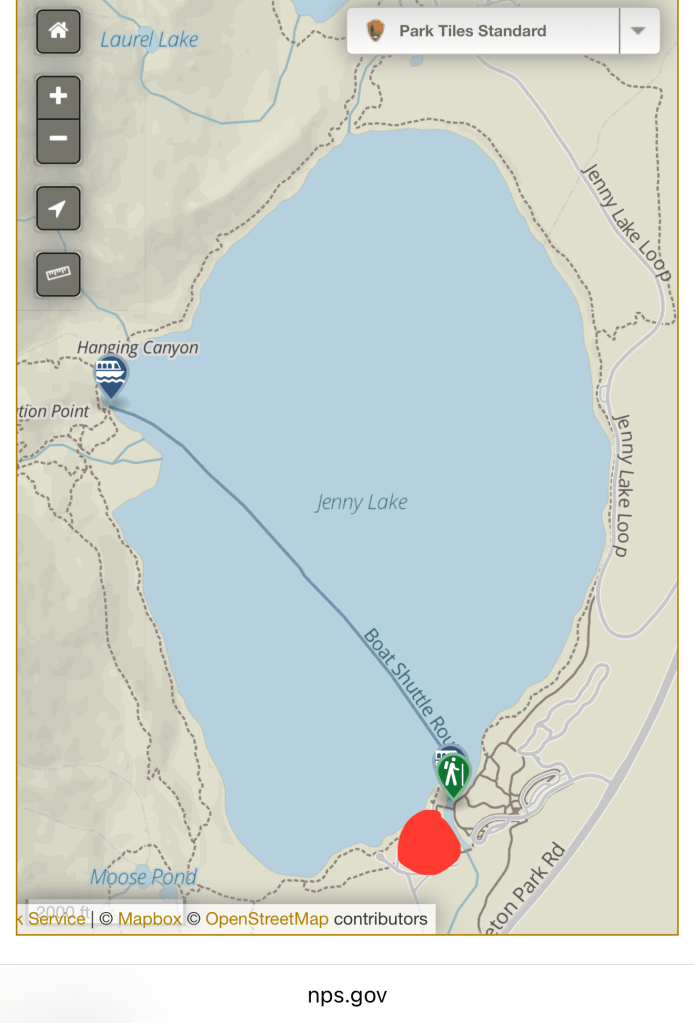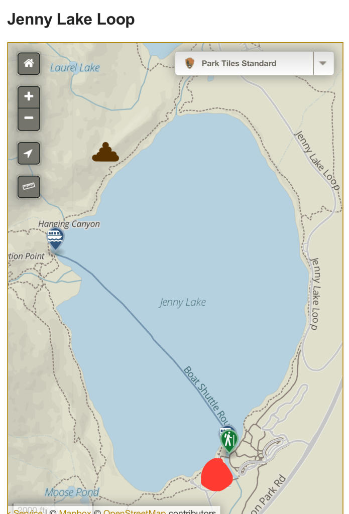 Our destination, the Jenny Lake Loop, a moderate 7.1 mile hike leading all the way around Jenny Lake. The little dashed line is the trail route. The goal is to start at the visitor center and hike around the whole dang thing. If you’re a big fat cheater, there’s a little pontoon boat ferry that will cut the hike to 2 or 2.5 miles, but we’re neither cheaters or wimps. We planned to hit the whole thing!