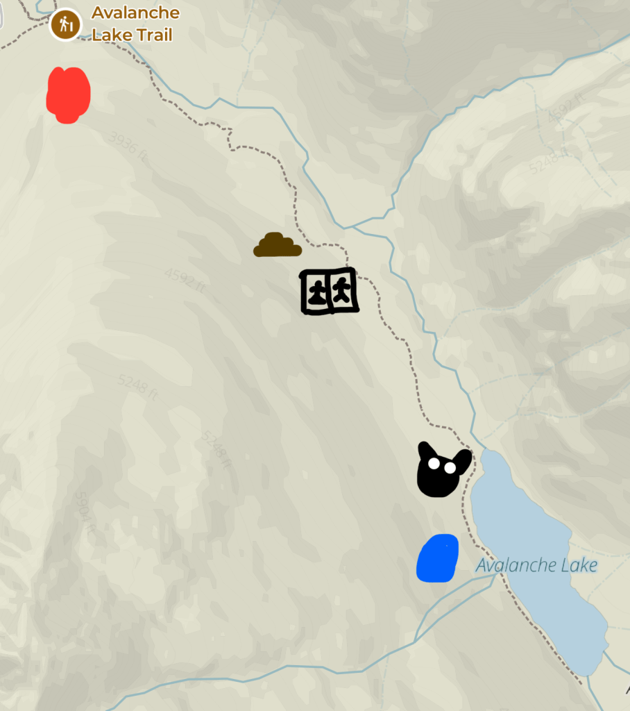 We came across Avalanche Lake just 50 yards further down the trail and lots of people. We spread the word about the bear, found a couple we thought we may be able to outrun, and headed back through bear sighting country towards the trail head. The bear was long gone, although our hearts were still beating a mile a minute.