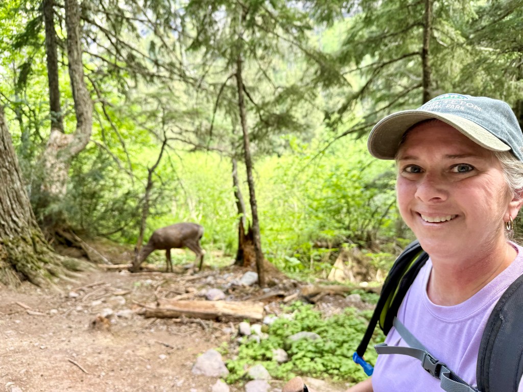 Ann’s initial response, after it registered that what she was looking in the eyes of was a young bear cub , was to loudly say “OH” and freeze. You’d think after thoroughly reading ALL the huge signs around the park that describe step by step what to do if you meet up with a bear, that Ann would do at least one thing right. Nope. At this point, Ben realized that something was off and turned around to see Ann’s face and it looked EXACTLY like the face she made when she thought she was being attacked by a bear at last night’s campfire. All Ann could say in her loudest whisper voice was “BEAR, BEAR, BEAR!” So, with no one around except for us, and armed with only a stale protein bar, an emergency weed gummy, a wadded up raincoat, a liter of water and a can of sunscreen to fight off a pissed off mama bear, we slowly and calmly kept walking down the path backwards until we felt we were out of danger (mostly). Luckily, the bear cub stayed put or ran the other way. Either way, we didn’t see it again, thank goodness.