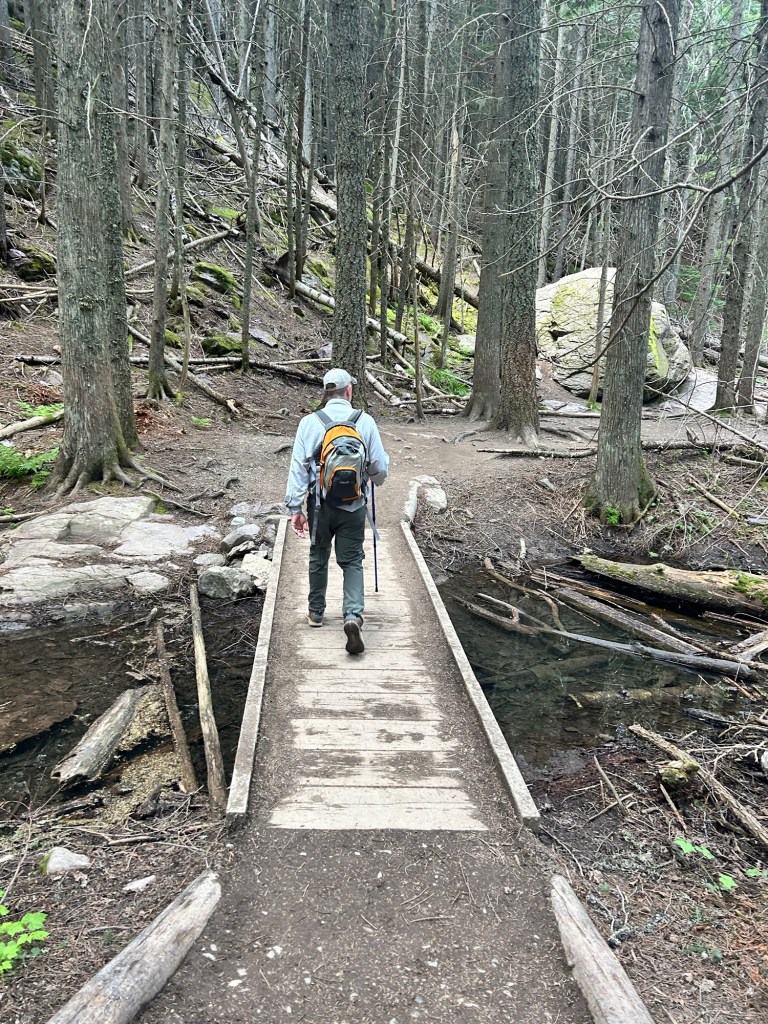 With minimal signage indicating the direction of the trail, and with zero GPS signal, we wandered the parking lot/ campground for the first 3/4 mile of our hike, looking for signs to lead us to the wilderness. Because she knew Ben wouldn’t ask for directions, Ann asked a group of young men who were getting ready for a hike if they knew where the trail head started. Each of the five men looked in a different direction, so that was all the answer we needed.