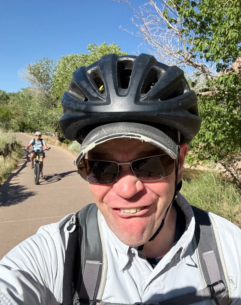 With my butt padded, our packs loaded with water, protein bars, important first aid stuff (that we’ve luckily not needed, thus far) and “pottying in the wild” supplies on our backs, as well as hiking poles wedged into Ben’s pack, we set off for the bike rental joint at the early hour of 8 am. I am NOT bright eyed nor bushy tailed at this time of the morning. We’re breaking my 9 am rule, simply to beat the heat.