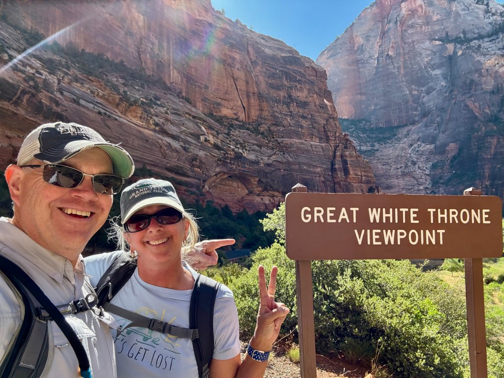 The views were just amazing! We biked all the way up to the top of the mountain, then turned around and glided back down for a while. When we wanted to stop for a pic, we stopped for a pic. For example, not far down the road from the top, was a sign for the Great White Throne! Now, by now, you should be well aware that any roadside throne must be investigated to prevent future incidents. We looked around for a while, but figured this must be metaphorical. No secret pooping places out here, sadly.