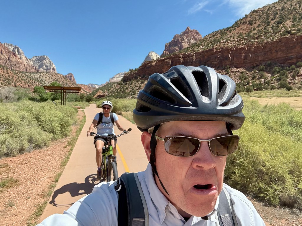 First of all, we don’t have to worry too much about snow on the road or freezing to death on this ride because it’s hot as heck here in Zion, so no need to pack extra layers or gloves. Secondly, no need to carry bear spray on our hip here, as we’re told that Zion isn’t really home to too many bears. Thirdly, my privates are mostly healed up and the butt cheek bruises are mostly faded from our Glacier bike ride. BUT JUST IN CASE, I made a very recent padded undergarment purchase, aka an “insurance policy,” so there shouldn’t be any pain today and I’m told my butt should ALSO look more shapely. 😉